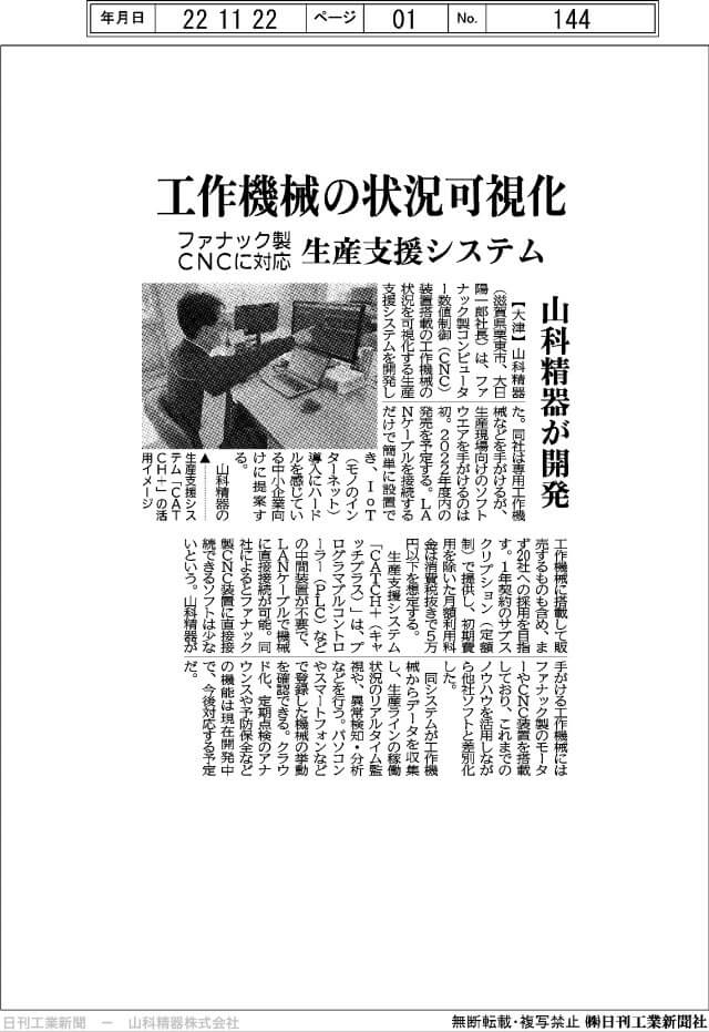 2022.11.22 メディア 日刊工業新聞に弊社の記事が掲載されました 2022年11月22日(火)、 弊社の記事が日刊工業新聞1面に掲載されました。 内容は、工作機械の状況を可視化できる 生産支援システム「 CATCH+」です。 どうぞご覧ください。 日刊工業新聞20221122